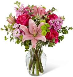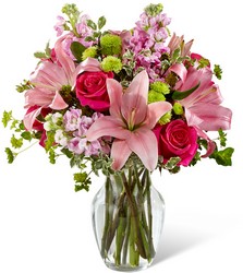 The FTD Pink Posh Bouquet is chic and pink to help you celebrate life's most treasured moments in style! Hot pink roses are bright and beautiful arranged amongst pink Asiatic Lilies, pink gilly flower, green button poms, bupleurum and lush greens to create that perfect gift of flowers. Presented in a clear glass vase, this blushing fresh flower arrangement is ready to send your sweetest wishes in honor of a birthday, an anniversary, or as a way to express your thanks and gratitude. GOOD bouquet is approx. 16"H x 13"W. BETTER bouquet is approx. 17"H x 14"W. BEST bouquet is approx. 18"H x 15"W. EXQUISITE bouquet is approx. 19"H x 17"W.
