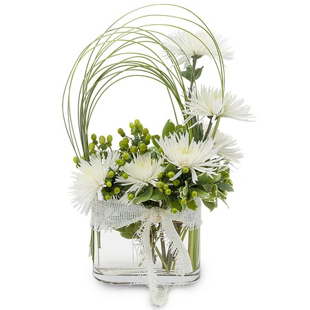 White Spider Mums, accented with berries and loops of Bear Grass make a clean, elegant combination. Approximately 8" W X 12" H