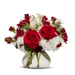 Say love with this vase of roses, hydrangea and elegant calla's. Approximately 10W X 8H